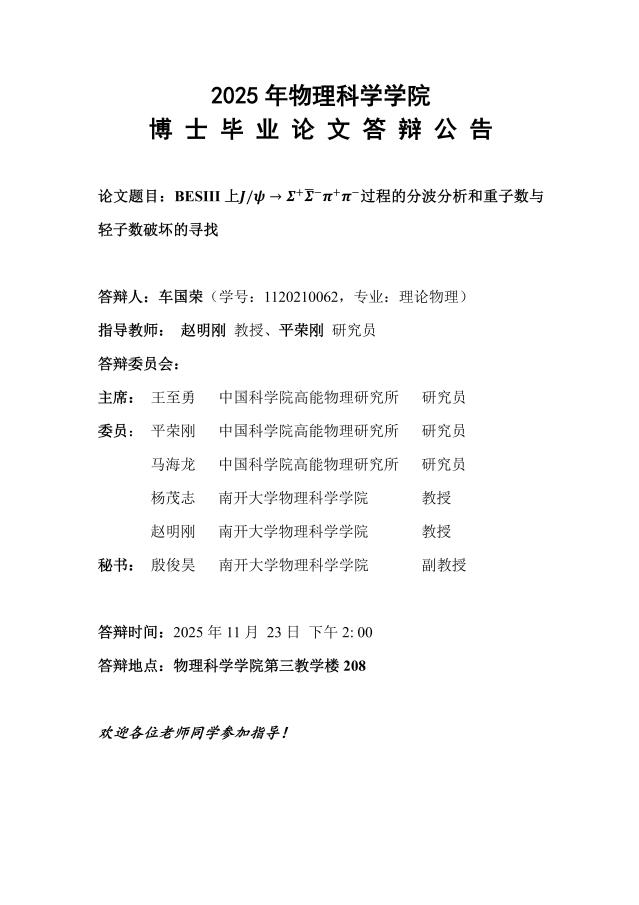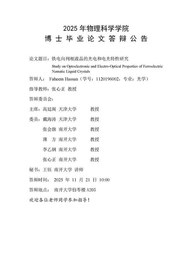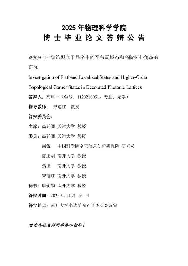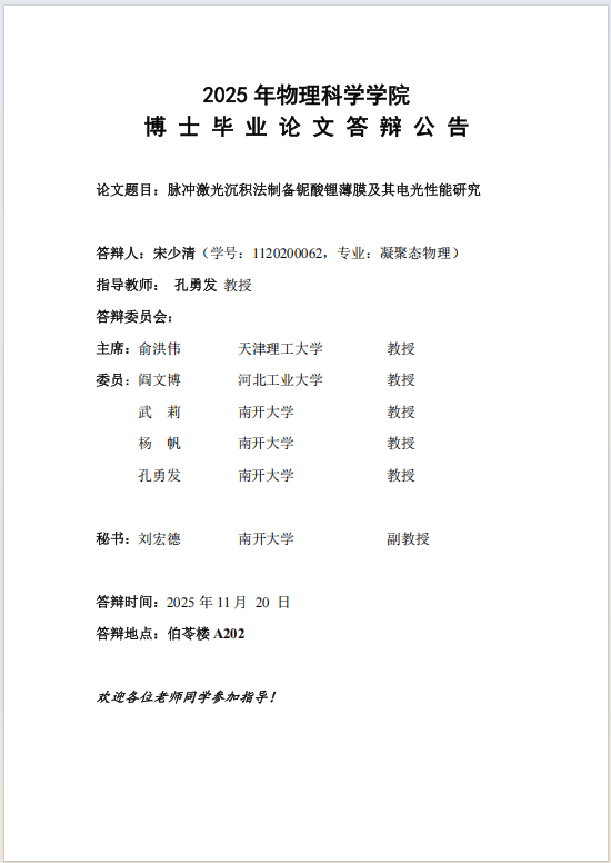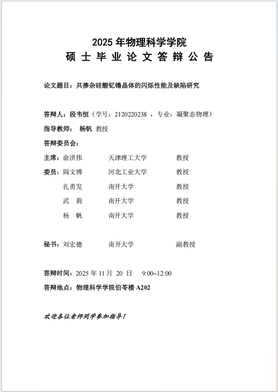 【毕业答辩】2025年秋季学期物理科学学院博士、硕士毕业论文答辩公告