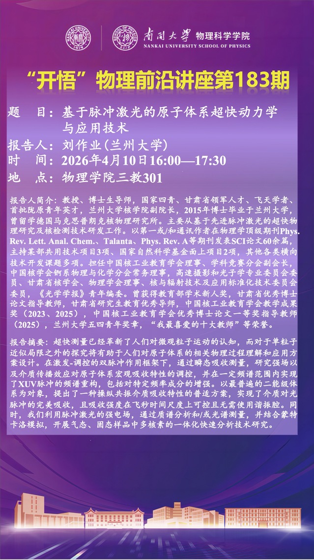 【“开悟” 物理前沿讲座 (第183期)】基于脉冲激光的原子体系超快动力学与应用技术