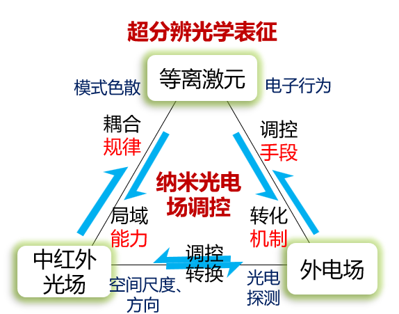 研究方向中红外波段承载着物质结构表征、热辐射调控与空间通信等关键物理过程,是连接材料内禀性质与功能应用的重要频谱区间。然而,该波段中光与物质相互作用普遍较弱,成为制约相关表征与器件性能提升的关键瓶颈。围绕这一核心问题,我们聚焦中红外等离激元光电子学研究,系统开展中红外光场与等离激元模式耦合规律的研究,发展等离激元模式色散工程与电控调控方法,实现纳米尺度光电场的精确调控,揭示材料超分辨光学表征的新机制,推动高灵敏、超分辨的材料科学表征、特征分子识别及光电探测应用。